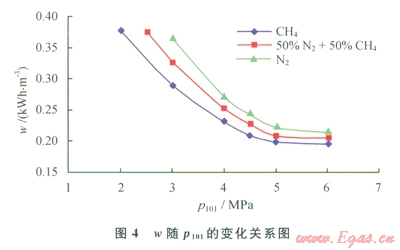 當(dāng)LNG儲存壓力(P104)為2MPa、氣體制冷劑膨脹前壓力(P204)為5MPa、氣體制冷劑膨脹前預(yù)冷溫度(t206)為-30℃時,在一定范圍內(nèi)改變進口天然氣壓力(P101),通過HYSYS軟件模擬計算可得到產(chǎn)品LNG的單位能耗(w),進而得到w隨P101的變化關(guān)系(圖4)。由南圖4可知,產(chǎn)品LNG單位能耗隨進口天然氣壓力的增加而降低。這是因為壓力越高,換熱器的平均換熱溫差越小,因而能耗越低。由于進口天然氣壓力的升高對承壓設(shè)備的要求也增加,故而不宜太高。因此,取P101為5MPa作為最優(yōu)進口壓力。