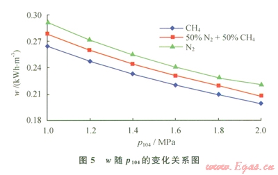 當(dāng)進口天然氣壓力(P101)為5MPa、氣體制冷劑膨脹前壓力(P204)為5MPa、氣體制冷劑膨脹前預(yù)冷溫度(t206)為-30℃時,在一定范圍內(nèi)改變LNG儲存壓力(P104),通過HYSYS軟件模擬計算可得到產(chǎn)品LNG的單位能耗(w),進而得到叫隨P104的變化關(guān)系(圖5)。由圖5可知,產(chǎn)品LNG單位能耗隨LNG儲存壓力的增加而降低,這是因為儲存壓力越高,對應(yīng)的液化溫度越高,所需的制冷量越少,因而能耗越低。然而儲存壓力的升高對儲存和輸運容器的耐壓要求也增高,增加了運輸成本[10]。取P104為2MPa作為最優(yōu)的LNG儲存壓力。