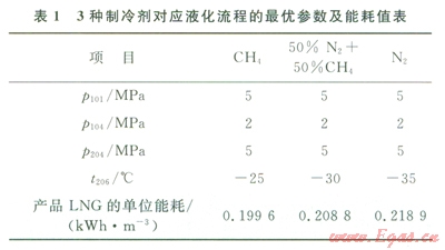 通??紤]到安全因素,N2是首選的膨脹制冷劑,為降低能耗,N2-CH4混合物也常被用作制冷劑[7]。通過上述對CH4、50%N2+50%CH4和N2這3種制冷劑的研究,可得到3種對應(yīng)液化流程的最優(yōu)參數(shù)及能耗值(表1)。由表l可知,CH4、50%N2+50%CH4和N2這3種制冷劑膨脹前預(yù)冷溫度的最優(yōu)值依次降低,這是由于N2的液化溫度低于CH4的液化溫度而造成的。由圖5及表l不難發(fā)現(xiàn)這3種制冷劑中N2的能耗最高,CH4的能耗最低,這是因為進口天然氣的比熱容隨溫度變化的性質(zhì)與CH4制冷劑的比熱容隨溫度變化的性質(zhì)十分接近[11],使得天然氣與制冷劑換熱時的平均溫差較小,炯損失較小,能耗也較低。