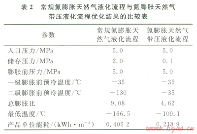 經(jīng)過模擬和優(yōu)化計算,表2列出了常規(guī)氮膨脹天然氣液化流程和氮膨脹天然氣帶壓液化流程的優(yōu)化結(jié)果。比較可知,二者的最優(yōu)入口壓力、膨脹前壓力和預(yù)冷溫度是相同的。由此可見,和常規(guī)氮膨脹流程相比,氮膨脹天然氣帶壓液化流程具有以下優(yōu)點:①膨脹比降低,約為前者的一半;②最低溫度為-l66℃,比前者提高了約56℃;③產(chǎn)品LNG單位能耗僅為0.2189kwh/m3,相較前者的0.4062kwh/m3降低了約46%;④此外,膨脹比的降低使其可以省去一個壓縮膨脹機組,使流程結(jié)構(gòu)更簡單,占地面積更小,并且使流程設(shè)備更少,初投資更低。