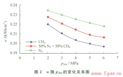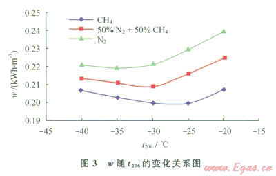 當(dāng)進口天然氣壓力(P101)為5MPa、LNG儲存壓力(P104)為2MPa、氣體制冷劑膨脹前壓力(P204)為5MPa時,在一定范圍內(nèi)改變氣體制冷劑膨脹前預(yù)冷溫度(t206),通過HYSYS軟件模擬計算可得到產(chǎn)品LNG的單位能耗(w),進而得到w隨t206的變化關(guān)系(圖3)。由圖3可知,產(chǎn)品LNG單位能耗先隨制冷劑膨脹前預(yù)冷溫度的增加而降低,后又隨之增加而增加。這是因為膨脹前溫度較低時,流程的熱負荷較大,造成制冷劑流量上升,壓縮機功耗隨之增加,從而導(dǎo)致產(chǎn)品LNG能耗增加。膨脹前溫度較高時,膨脹后的溫度也較高,引起膨脹后壓力自調(diào)節(jié)降低壓力,壓縮機功耗隨之增加,從而導(dǎo)致產(chǎn)品LNG能耗增加。故而制冷劑存在一個最優(yōu)膨脹前壓力,南圖3可知,t206為-25℃、-30℃、-35℃時分別是CH4、50%N2+50%CH4、N2制冷劑的最優(yōu)膨脹前預(yù)冷溫度。