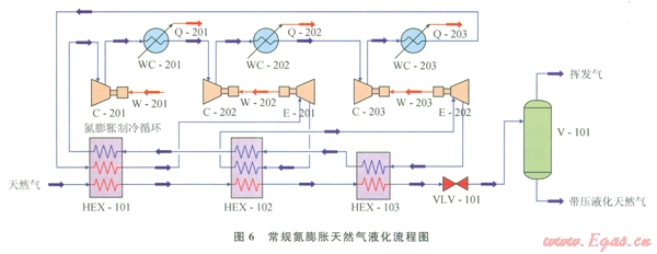 HYSYS模擬的常規(guī)氮膨脹天然氣液化流程如圖6所示[12]。經(jīng)過預(yù)處理后的進口天然氣通過換熱器HEX-l01和HEX-l02降溫,然后節(jié)流至l01kPa變?yōu)?span lang="EN-US">LNG,送入儲罐V-101。液化流程所需冷量由氮膨脹制冷循環(huán)提供,由于常規(guī)液化流程所需的低溫更低,若采用單級膨脹會導(dǎo)致膨脹機的膨脹比非常大,故而一般采用兩級膨脹為流程提供冷量和所需的低溫。氮氣制冷劑首先經(jīng)過三級壓縮水冷器,再進入膨脹機E-201膨脹降溫,接著進入換熱器HEX-102為其提供冷量,然后進入膨脹機E-202繼續(xù)膨脹降溫,接著依次通過三級換熱器為其提供冷量,最后復(fù)溫回到壓縮機。其中膨脹機E-201和E-202產(chǎn)生的膨脹功分別由壓縮機C-202和C-203完全回收利用,構(gòu)成兩個壓縮膨脹機組。由于常規(guī)天然氣液化流程的進口天然氣要經(jīng)過CO2預(yù)處理,CO2的含量一般不超過0.01%。因此,這里仍舊取99.99%CH4+0.01%CO2作為進口原料氣。