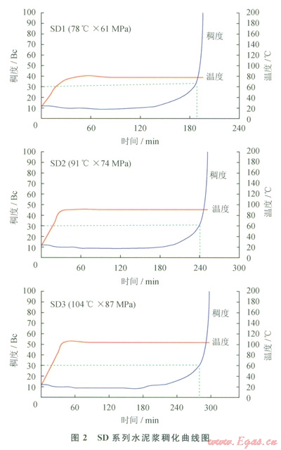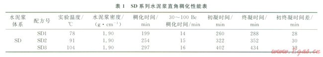 同井形成的水泥環(huán)需要滿足不同氣田的地質(zhì)條件對力學性能及界面膠結(jié)性能的要求,各個油氣田做了大量研究試驗工作[10],在該氣田采用了SD系列固井水泥添加劑,該體系使水泥漿具有很好的直角稠化性能,在水泥漿從液態(tài)轉(zhuǎn)為固態(tài)的過渡階段,地層流體在環(huán)空形成竄流的風險大大降低(圖2、表l)。