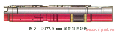 地層易漏和發(fā)生氣竄風險較高的固井施工,采用帶有管外封隔器的固井工具。Æl77.8mm尾管固井施工中,使用帶有管外封隔器的尾管懸掛器(圖3)。頂替水泥漿過程結(jié)束后,座封管外封隔器,在Æ177.8mm尾管與上層Æ244.5mm套管之間的環(huán)空實現(xiàn)完全封隔,循環(huán)洗井過程增加的壓力無法傳遞到裸眼段,同時還可阻止地層流體進入封隔器以上的Æ244.5mm套管。