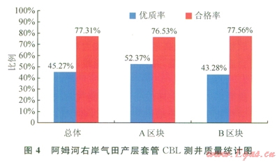 2008年川慶鉆探土庫曼分公司在阿姆河右岸應用上述防氣竄固井技術(shù)先期進行了6口井的先導性試驗,提高固井質(zhì)量效果明顯??偨Y(jié)應用試驗結(jié)果后,中國石油川慶鉆探工程公司井下作業(yè)公司對固井技術(shù)做了進一步優(yōu)化,截止到2011年l2月,在39口井中應用情況良好,CBL測井質(zhì)量優(yōu)質(zhì)率達到45.27%(圖4),合格率達到77.31%,目前該區(qū)塊環(huán)空帶壓情況由2008年之前的40%下降到目前的6%。
