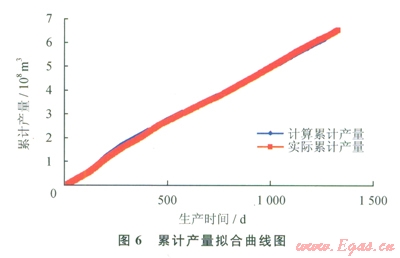 采用筆者提出的方法對(duì)該氣藏的動(dòng)態(tài)儲(chǔ)量進(jìn)行分析,首先將2口生產(chǎn)井等價(jià)為1口井,再利用實(shí)測(cè)地層壓力為約束條件,采用氣藏生產(chǎn)動(dòng)態(tài)數(shù)據(jù)進(jìn)行擬合,產(chǎn)量、壓力、累計(jì)產(chǎn)量擬合曲線如圖4~6所示,歷史擬合效果好。圖7為該氣藏的壓降關(guān)系曲線,由壓降關(guān)系式P/Z=-0.711Gp+21.661,可推出該氣藏的動(dòng)態(tài)地質(zhì)儲(chǔ)量為30.4×108m3。從圖8可以看出,目前累計(jì)水侵量達(dá)300×104m3,表明水體活躍程度高。