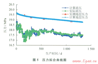 前面4個(gè)測(cè)試點(diǎn)呈現(xiàn)線性關(guān)系,從第5個(gè)測(cè)試點(diǎn)開始明顯偏離直線段,說明有水侵發(fā)生。若采用水驅(qū)氣藏的壓降法計(jì)算動(dòng)態(tài)儲(chǔ)量,則根據(jù)前面4個(gè)數(shù)據(jù)點(diǎn)的線性關(guān)系為y=-0.289x+22.94,外推出動(dòng)態(tài)地質(zhì)儲(chǔ)量為97.4×108m3,這個(gè)值遠(yuǎn)遠(yuǎn)超過該層的地質(zhì)儲(chǔ)量38.58×108m3,說明水侵發(fā)生得更早。