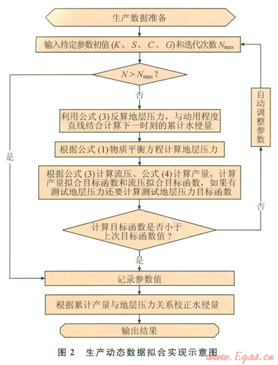 最終水侵量的確定既要通過生產(chǎn)歷史擬合結(jié)果又要通過地層壓力變化校正。這樣既考慮了水侵對(duì)地層壓力的影響,又考慮了物質(zhì)平衡方程,其實(shí)現(xiàn)框圖如圖2所示。計(jì)算步驟為:①數(shù)據(jù)準(zhǔn)備(基礎(chǔ)數(shù)據(jù)、生產(chǎn)動(dòng)態(tài)數(shù)據(jù)、試井解釋結(jié)果參數(shù))和迭代次數(shù);②確定需要擬合的待定參數(shù),假設(shè)待定參數(shù)的初始值的范圍、初始動(dòng)態(tài)地質(zhì)儲(chǔ)量,確定動(dòng)用儲(chǔ)量直線;③根據(jù)參數(shù)用式(3)計(jì)算歹;加,根據(jù)無因次壓力的定義跏反算地層壓力,根據(jù)地層壓力與累計(jì)產(chǎn)氣量關(guān)系作如圖l所示的曲線,根據(jù)視地層壓力與動(dòng)用儲(chǔ)量線的差值計(jì)算下一個(gè)時(shí)刻的累計(jì)水侵量,根據(jù)物質(zhì)平衡方程計(jì)算下一個(gè)時(shí)刻的地層壓力,根據(jù)式(3)、(4)計(jì)算流壓和產(chǎn)量,計(jì)算流壓擬合目標(biāo)函數(shù)、產(chǎn)量擬合目標(biāo)兩數(shù)及地層壓力目標(biāo)函數(shù);④判斷迭代次數(shù)是否結(jié)束,若沒結(jié)束,就與上次目標(biāo)值比較,如果比上次值小,且記錄目前參數(shù)值,如果比上次值大,重復(fù)步驟②,調(diào)整參數(shù),如果達(dá)到最佳擬合轉(zhuǎn)入步驟④;如果迭代次數(shù)完成,輸出結(jié)果。