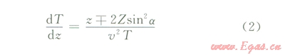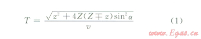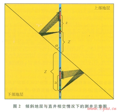 圖2顯示了傾斜地層與直井相交情況下的測井。由傾斜地層產(chǎn)生的反射波按照傳播方向可分為上行反射波和下行反射波。設(shè)地層與井的夾角是a,反射波旅行時(shí)表達(dá)式為: