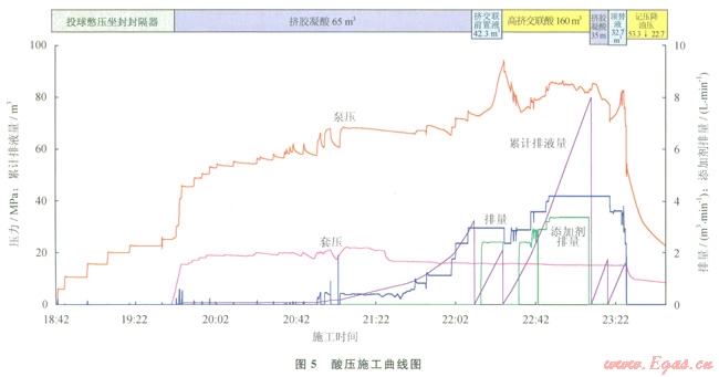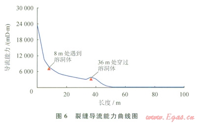利用實(shí)驗(yàn)確定了典型地質(zhì)體的響應(yīng)特征,以該響應(yīng)特征為依據(jù)對(duì)實(shí)際井?dāng)?shù)據(jù)進(jìn)行解釋,建立一系列的特征圖集或解釋圖版,在后續(xù)生產(chǎn)中可以用圖版對(duì)測井資料進(jìn)行解釋[12-13]。圖4是塔里木油田A井的一段碳酸鹽巖段綜合解釋成果圖。從圖中可以看出XX20~XX30m井段,成像測井在XX26m解釋一條40cm高的裂縫,孔隙度小于1.8%,電阻率大于1000W·m,綜合評(píng)價(jià)為Ⅲ類儲(chǔ)集層,開井流動(dòng)曲線呈一條直線,關(guān)井壓力恢復(fù)緩慢,壓力歷史曲線反映測試層為特低滲透性儲(chǔ)集層,僅從常規(guī)分析這類儲(chǔ)集層即使酸化壓裂也不會(huì)獲得工業(yè)油氣流。而對(duì)應(yīng)遠(yuǎn)探測成像圖上可以看出在XX20~XX28m距井壁3~10m的地方發(fā)現(xiàn)反射信息比較明顯,為雙邊成像,同相軸幾乎為直線,但兩側(cè)的同相軸延長線在在一條線上,裂縫角度較高,根據(jù)圖版可以評(píng)價(jià)為高角度井旁裂縫。建議中國石油塔里木油田公司勘探公司進(jìn)行試油,該建議被采納,酸壓后6mm油嘴日產(chǎn)氣l0多萬立方米、油l0多立方米。從圖5酸壓施工曲線分析,擠膠凝酸注入過程壓力平穩(wěn)上升,人造裂縫正常延伸,沒有溝通儲(chǔ)層縫、洞的跡象;再次擠膠凝酸后,壓力有明顯下降,說明溝通了縫洞系統(tǒng)。從圖6裂縫導(dǎo)流能力曲線圖上分析在裂縫延伸方向8m處遇到溶洞區(qū),在36m處穿過溶洞區(qū)。證實(shí)遠(yuǎn)探測聲波反射波成像解釋是正確的。