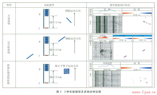 實(shí)驗(yàn)過程中用2m×lm×1mm的鋼板模擬裂縫,用2m×lm×0.5m的鐵制網(wǎng)狀籠子裝上大小不等的鵝卵石模擬溶蝕孔洞,把儀器水平放入水中,保持儀器在水中靜止,模型做勻速運(yùn)動(dòng),記錄一組數(shù)據(jù),據(jù)此做不同類型的模擬實(shí)驗(yàn),得到各種響應(yīng)特征。圖3是在消聲水池做的3類實(shí)驗(yàn)?zāi)P图捌漤憫?yīng)特征圖。圖中井旁裂縫,鋼板中心位置距儀器3m,與儀器夾角為-20°(逆時(shí)針為負(fù),順時(shí)針為正),儀器源距為5.3m,從原始波形圖上看,反射波的傾斜同相軸非常明顯,從模型來分析這種情況只有下行波,不存在上行波,因此,在處理過程中波分離后直接進(jìn)行成像,沒有進(jìn)行上下行波分離,得到一組單邊的條帶狀同相軸,其形狀、走勢、夾角與模型基本一致,同相軸的中點(diǎn)大約為3m與鋼板距儀器的距離一致;過井壁裂縫,兩塊一樣的鋼板分別放在儀器兩側(cè)與儀器的夾角為20°,兩塊板中點(diǎn)都距儀器3m,從原始波形上看有兩組不同走勢的反射波,從理論分析這種情況會(huì)出現(xiàn)上下行反射波,對(duì)其進(jìn)行處理并雙邊成像,可以看出在上下行反射波成像圖上各有一組條帶狀的同相軸,且兩組同相軸在一條直線上;孔洞或網(wǎng)狀縫,用三角鐵焊成2m×1×0.5m的長方形骨架,然后用的鐵絲網(wǎng)把6個(gè)面封好,里面裝上鵝卵石來模擬溶蝕孔洞,放置中心距儀器3m,從理論分析這種模型的反射是雜亂無章的,處理過程中在波分離完直接對(duì)其進(jìn)行了成像沒有進(jìn)行上下行波的分離,從成像圖上看呈雜亂無章的斑點(diǎn)狀。
