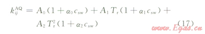 2)對混合規(guī)則作出改進,非水相和水相分別采用兩套不同的二元交互作用系數(shù)。非水相中的烴水交互作用系數(shù)采用擬合的固定值;水相中的烴—水交互作用系數(shù)(kijAQ)作為烴組分偏心因子(w)、對比溫度(Tr)和礦化度(csw)的函數(shù),即