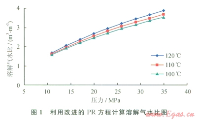 利用改進的PR方程結(jié)合相平衡模型計算不同溫度、壓力條件下的溶解氣水比(圖1)。