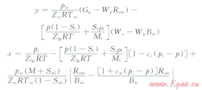 注意到x和y均為壓力的函數(shù),不同壓力下的數(shù)據(jù)點在y—x坐標圖中應(yīng)位于同一直線上,直線的斜率即原始烴類孔隙體積。計算過程中可采用試算法確定部分未知項。包含自由氣與水溶氣的總儲量為: