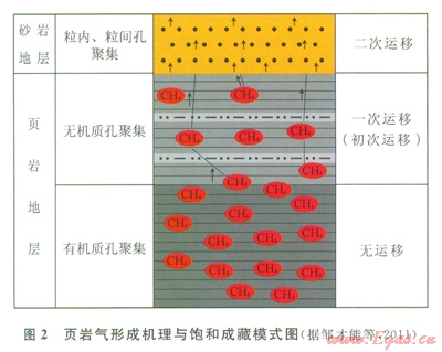 烴源巖排烴后烴類氣體(主要是甲烷)基本無運移或頁巖層內(nèi)短距離運移,屬于“自生自儲”,而常規(guī)天然氣要經(jīng)過二次運移,從生氣層運移到儲氣層(圈閉)中聚集成藏(2)