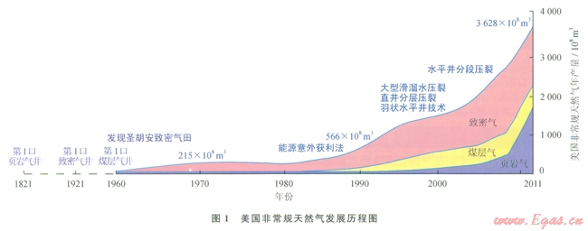 非常規(guī)油氣已成為國內(nèi)外油氣行業(yè)研究和關(guān)注的熱點,中國石油評選的“2011年國際石油十大科技進展”中,其中有4項內(nèi)容與非常規(guī)油氣勘探開發(fā)直接相關(guān):①儲層物性納米級實驗分析技術(shù)投入應(yīng)用,改變了傳統(tǒng)的儲層孑L喉結(jié)構(gòu)表征方法,建立了非常規(guī)儲層性質(zhì)有效評價體系,大大拓展了全球油氣勘探領(lǐng)域;②致密油開發(fā)關(guān)鍵技術(shù)突破實現(xiàn)工業(yè)化生產(chǎn)應(yīng)用,使美國致密油開發(fā)取得突破,將引領(lǐng)和帶動全球致密油勘探開發(fā)進程;③綜合地球物理方案提高非常規(guī)油氣勘探開發(fā)效益;④水平井鉆井技術(shù)創(chuàng)新推動頁巖氣大規(guī)模開發(fā)[2]。