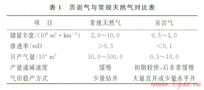 頁巖氣一般具有低豐度、低滲透率、低產(chǎn)量的特點,與常規(guī)天然氣相比,屬于典型的“邊緣資源”(1)。因此,開發(fā)頁巖氣須采用不同于常規(guī)天然氣的理念、思路與技術(shù)。