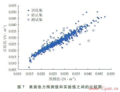 仔細(xì)研究所獲結(jié)果,可以發(fā)現(xiàn)“訓(xùn)練”集的相對誤差總是小于“驗證”集或“測試”集的相對誤差,這主要是因為“驗證”集或“測試”集對ANN的訓(xùn)練方式?jīng)]有直接影響。因此,對人工神經(jīng)網(wǎng)絡(luò)進(jìn)行了修正,使其更適合于“訓(xùn)練”集的數(shù)據(jù)??梢园延?xùn)練過程想象為找出方程組的待定系數(shù)。