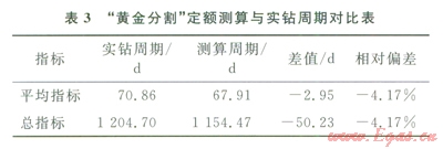 塔里木油田輪南區(qū)塊近4年共完鉆井18口,按照鉆井定額編制原則,選出17口與標(biāo)準(zhǔn)井井型類似的基礎(chǔ)井,編制該區(qū)塊鉆井周期定額。定額測(cè)算周期與實(shí)際鉆井周期對(duì)比結(jié)果見(jiàn)表3。可以看出,采用“黃金分割”測(cè)算出的平均單井鉆井周期比實(shí)際統(tǒng)計(jì)周期縮短2.95d,定額相對(duì)偏差為4.17%,滿足工程實(shí)踐需要。