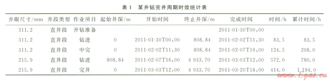 按石油鉆井技術(shù)經(jīng)濟(jì)指標(biāo)分類,將一口井鉆井用井眼尺寸劃分出不同井段(直井段、定向段和水平段),然后將鉆井過(guò)程分為開(kāi)鉆準(zhǔn)備、鉆進(jìn)、完井作業(yè)3個(gè)項(xiàng)目,其中鉆進(jìn)周期為該井眼尺寸自開(kāi)始鉆進(jìn)至鉆達(dá)設(shè)計(jì)固井深度或固井層位耗費(fèi)的時(shí)間,不包括堵漏、中途測(cè)試及取心等時(shí)間;完井周期為鉆達(dá)固井深度后進(jìn)行測(cè)井、下套管、注水泥及候凝等至下一次開(kāi)鉆前耗費(fèi)的時(shí)間,如果是鉆達(dá)設(shè)計(jì)地質(zhì)目的層,進(jìn)行完井作業(yè)就是完井時(shí)間。我們采用時(shí)間點(diǎn)原則分別對(duì)不同井眼尺寸的作業(yè)時(shí)間進(jìn)行統(tǒng)計(jì)(表1)。