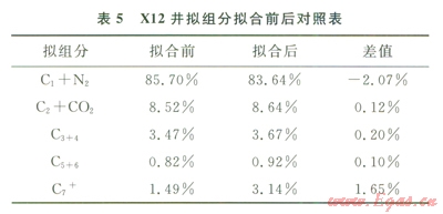 根據(jù)相態(tài)恢復(fù)理論,利用數(shù)值模擬軟件Eclipse中的高壓物性分析模型(PVTi),選取取樣時(shí)間早、相平衡較好的Xl2井的高壓物性實(shí)驗(yàn)數(shù)據(jù)進(jìn)行相態(tài)恢復(fù)。首先,對(duì)原始PVT數(shù)據(jù)進(jìn)行模擬形成臨界參數(shù)場(chǎng);然后,在目前壓力下,向平衡凝析氣中逐漸加入少量平衡油,再計(jì)算露點(diǎn)壓力,若計(jì)算的露點(diǎn)壓力低于地層壓力,則繼續(xù)在新的露點(diǎn)壓力下加入該壓力下的平衡油,直到露點(diǎn)壓力恢復(fù)到原始地層壓力?;謴?fù)到原始地層壓力下的流體組分,可以代表原始?xì)獠貤l件下的流體。相態(tài)恢復(fù)前后對(duì)照表表明,相態(tài)恢復(fù)后潛在凝析油含量C5+提高了1.75%,凝析油含量達(dá)到2499/m3(表5)。通過相態(tài)恢復(fù)模擬飽和凝析氣藏地層流體高壓物性特征,為開發(fā)技術(shù)政策制定和氣藏動(dòng)態(tài)預(yù)測(cè)奠定了基礎(chǔ)。