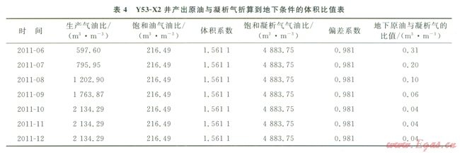 選取產(chǎn)油量最高的Y53-X2氣井進(jìn)行分析,該井投產(chǎn)第一個(gè)月,平均日產(chǎn)氣2.04×104 m3,平均日產(chǎn)油35.27t,油氣比達(dá)到l7.29t/104m3,產(chǎn)出油密度0.8055g/cm3,含蠟量l3.63%,屬于原油。在實(shí)驗(yàn)室測(cè)得Y53-X2井原始地層條件下飽和油的氣油比為216.49m3/m3,飽和凝析氣氣油比為4883.75 m3/m3,結(jié)合實(shí)際生產(chǎn)過程中產(chǎn)出流體的油氣比,計(jì)算該井不同時(shí)間產(chǎn)出天然氣與產(chǎn)出原油在地下的體積比(表4),結(jié)果表明產(chǎn)出流體中原油的比例迅速降低,表現(xiàn)為局部聚集原油的特征。Y53-X2井采氣曲線也表明隨著生產(chǎn)的進(jìn)行,產(chǎn)出原油迅速下降,該井投產(chǎn)279d后,氣產(chǎn)量基本保持2×104m3/d,油產(chǎn)鰱從初期的45t/d降至2.0t/d(圖5),油產(chǎn)量及油氣比迅速下降,同樣說明井底附近原油有限。