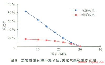定容衰竭實(shí)驗(yàn)表明當(dāng)壓力衰竭至l8MPa時(shí),反凝析液量達(dá)到最大為10.14%,而在分級(jí)壓力為4MPa時(shí),凝析油的采收率為l6.99%,天然氣采收率為82.54%(圖7、8)。飽和凝析氣藏一當(dāng)開井,在地層中即有凝析油析出,安岳地區(qū)須二段氣藏氣井目前的生產(chǎn)動(dòng)態(tài)以及試井解釋分析表明近井地帶已經(jīng)有凝析油析出,存在反凝析傷害。