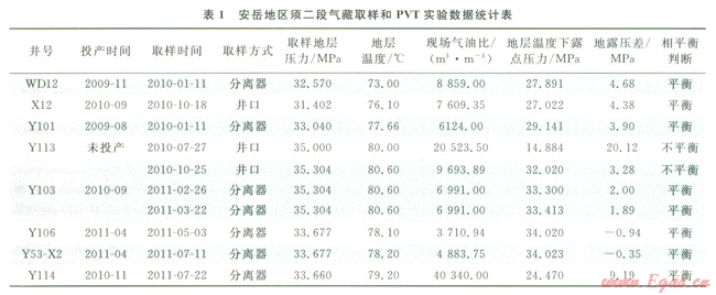 結(jié)合傳統(tǒng)與室內(nèi)實(shí)驗(yàn)判斷結(jié)果綜合分析安岳地區(qū)須二段氣藏為飽和凝析氣藏,由于儲(chǔ)層的非均質(zhì)性導(dǎo)致了局部有少量原油存在,即使個(gè)別井口可能會(huì)出現(xiàn)開井初期產(chǎn)出大量原油的現(xiàn)象,但是隨著生產(chǎn)的進(jìn)行,原油產(chǎn)出量也會(huì)迅速下降,由此,將安岳地區(qū)須二段氣藏類型確定為帶“油墊”的飽和凝析氣藏。從成藏的角度看,可能由于致密強(qiáng)非均質(zhì)氣藏中原油的差異聚集或原油的裂解,致使局部存在少量原油。