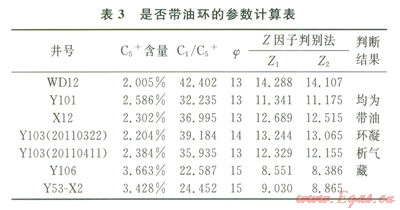 傳統(tǒng)氣藏類型判斷方法有相圖法[3]和經(jīng)驗(yàn)法,其中經(jīng)驗(yàn)法又有4種[2]之多。根據(jù)8個(gè)樣品擬合的相圖判斷,除2口氣井(Y106和Y53-X2)具有飽和凝析氣藏的特征外,其余樣品均只表現(xiàn)出凝析氣藏的特征(圖2、3);根據(jù)經(jīng)驗(yàn)判斷法,各井均為凝析氣藏,且四參數(shù)法、j1參數(shù)法、含氣系數(shù)與C2+含量關(guān)系法均判斷Yl06和Y53-X2井為飽和或者帶“油環(huán)”的凝析氣井(表2)。根據(jù)4種專門判斷是否帶油環(huán)的常規(guī)經(jīng)驗(yàn)法,安岳地區(qū)須二段氣藏7口井均為帶“油環(huán)”或者帶“大油環(huán)”的凝析氣藏(表3)。實(shí)際上,安岳地區(qū)須二段氣藏產(chǎn)原油井位置、層段與構(gòu)造和海拔無關(guān),尚未發(fā)現(xiàn)明顯的油氣界面,常規(guī)方法判斷氣藏類型與實(shí)際存在差異。