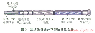 第二次開鉆進(jìn)行連續(xù)油管鉆井試驗(yàn)(3),Æ215.9mm鉆頭鉆達(dá)設(shè)計(jì)試驗(yàn)井深350 m。主要鉆遇泥巖、頁(yè)巖和砂巖。鉆井參數(shù):鉆壓為2030kN,排量為1820Ls,泵壓為35MPa。鉆井液參數(shù):密度為1.051.15gcm3,漏斗黏度為3840s,API失水量為5mL,泥餅厚度為0.5mm。鉆具組合:Æ215.9mm鉆頭+Æ165.1mm螺桿鉆具+431×4A0接頭+5Æl52.4mm鉆鋌+4A1×310接頭+Æ120.65mm馬達(dá)頭總成+Æ139.7mm連接器+Æ88.9mm連續(xù)油管。