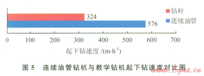 連續(xù)油管鉆井的一大優(yōu)點(diǎn)就是起下鉆無需接單根。在現(xiàn)場(chǎng)進(jìn)行連續(xù)油管起下鉆時(shí)平均速度為0.16ms(576mh)(5)。而常規(guī)鉆井時(shí),如果5min起下一根立根(27m),則起下鉆速度也僅為324mh,因此在鉆井試驗(yàn)中連續(xù)油管起下鉆速度是常規(guī)鉆桿起下鉆速度的l.78倍。考慮到連續(xù)油管注入頭的最大提升速度是0.8ms,因此在保證起下鉆安全的情況下,連續(xù)油管起下鉆速度可以達(dá)到常規(guī)鉆桿起下鉆速度的3倍。