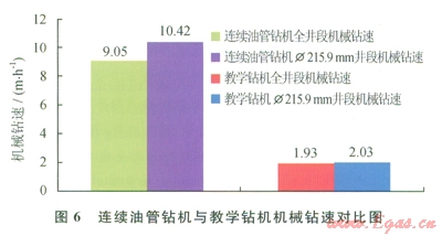 在相同地質(zhì)狀況和用同一臺(tái)鉆井泵的情況下,將連續(xù)油管鉆機(jī)與相距35.6m處宏華2號(hào)教學(xué)鉆機(jī)(ZJ40DBS鉆機(jī)+頂驅(qū))的鉆井情況進(jìn)行對(duì)比如下: