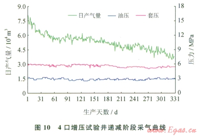 C井區(qū)投產(chǎn)井9口,20071月開始增壓生產(chǎn),截止到200612月,歷年累計(jì)產(chǎn)氣3.9526×108m3,地質(zhì)儲量采出程度3.49%。20093月增壓穩(wěn)產(chǎn)期結(jié)束,進(jìn)入增壓產(chǎn)量遞減階段。