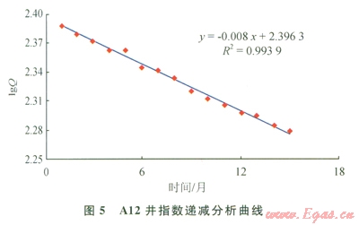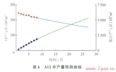 多數(shù)單井遞減率接近20%,l4口單井產(chǎn)量遞減類型符合指數(shù)遞減,6口單井產(chǎn)量遞減類型符合調(diào)和遞減。如Al2井,初始產(chǎn)量為249.0577×104m3,初始遞減率為0.0184,年遞減率19.83(5、6),產(chǎn)能遞減方程為: