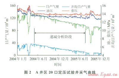 A井區(qū)投產(chǎn)井27口,20041月開始定壓生產(chǎn)試驗(yàn),累計(jì)產(chǎn)氣24.1306×108m3,地質(zhì)儲量采出程度12.11%。試驗(yàn)期間平均生產(chǎn)油壓l3.5MPa,200510月檢修關(guān)井結(jié)束。7口井受到動態(tài)監(jiān)測影響生產(chǎn)不連續(xù),整理符合產(chǎn)量遞減條件的20口試驗(yàn)井生產(chǎn)數(shù)據(jù),試驗(yàn)初期產(chǎn)氣量134.2271×104m3d,試驗(yàn)?zāi)┢诰诋a(chǎn)氣量98.3783×104m3d(2)。