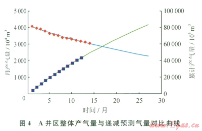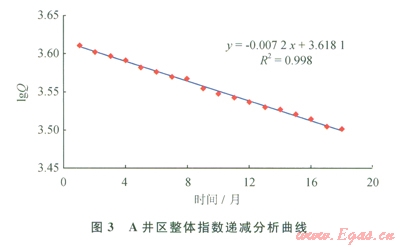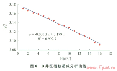 A井區(qū)和B井區(qū)同屬于高滲透區(qū)塊,在定壓生產(chǎn)條件下的產(chǎn)量遞減規(guī)律均符合指數(shù)型;隨著氣藏開發(fā)的進(jìn)行,氣藏采出程度增大(A井區(qū)采出程度l2.11%,B井區(qū)采出程度34.06),井口壓力降低(A井區(qū)13.5MPaB井區(qū)6.0MPa),氣井的泄流半徑有所增加,在采氣速度基本一致的情況下,產(chǎn)量遞減有所減緩[10]。