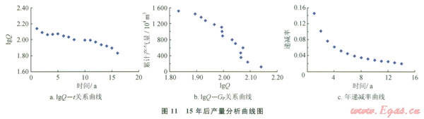 筆者根據(jù)氣田產(chǎn)量的變化規(guī)律,采用JJArps遞減的3種最基本規(guī)律(即指數(shù)遞減、調(diào)和遞減和雙曲線遞減規(guī)律),通過繪制產(chǎn)量與時間的關(guān)系曲線,然后求取方程的解來分析研究產(chǎn)量的遞減規(guī)律和產(chǎn)量預(yù)測[3-8]。即