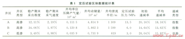 靖邊氣田投入開發(fā)后選取了3個典型區(qū)塊開展定壓生產(chǎn)試驗(yàn):A井區(qū)20041月至2005l0月,試驗(yàn)階段油壓l3.5Mpa[9]B井區(qū)20097月至201112月,試驗(yàn)階段油壓為6.4MPaC井區(qū)在20093月增壓穩(wěn)產(chǎn)期結(jié)束后定壓生產(chǎn),定壓生產(chǎn)階段油壓為3.0MPa。通過計(jì)算分析上述3個不同壓力的定壓生產(chǎn)數(shù)據(jù),研究下古生界氣藏典型區(qū)塊的產(chǎn)量遞減規(guī)律。