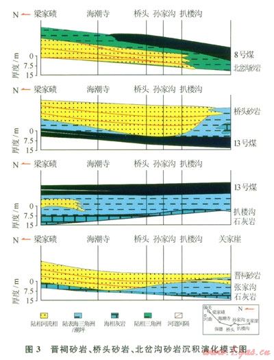 3套典型砂巖體的沉積表明了北部地勢的坳隆和沉降幅度的反復(fù)變化,也表明陸表海環(huán)境下大型河流快速侵入并持續(xù)沉積的存在。晉祠砂巖沉積時期,地勢北高南低,河流由北向南快速侵入,主干河道發(fā)育在研究區(qū)北部和中東部;隨后北部地勢沉降幅度變大,沉積的扒樓溝石灰?guī)r表明了海域中心向北的遷移,地勢也相應(yīng)南高北低;之上發(fā)育了在該區(qū)和整個鄂爾多斯盆地東緣廣泛分布的13號煤層,在13號煤層的泥炭沼澤沉積之時,北部地勢仍略低,但受廣泛的泥炭沼澤堆積影響,地勢已經(jīng)接近平緩;橋頭砂巖沉積時期的河流再次由北向南沖積,大型的河流對下部的泥炭沼澤起沖刷作用,此時地勢轉(zhuǎn)變?yōu)楸备吣系?;隨后陸表海海水的再次侵入和11號、12號煤層成煤沼澤的堆積在一定程度上又減緩了北部隆起的趨勢;北岔溝砂巖河流沉積的影響范圍較前兩次進(jìn)一步擴(kuò)大,往南延伸到三交、柳林地區(qū),北部地勢進(jìn)一步隆起,泥炭沼澤逐漸向南轉(zhuǎn)移(3)。