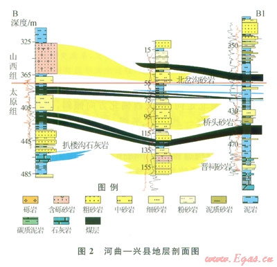 該區(qū)地層產(chǎn)狀平穩(wěn),構(gòu)造簡單(基本上為單斜構(gòu)造),呈近南北走向、西或西偏北方向傾斜,傾角510℃,區(qū)內(nèi)發(fā)育一些產(chǎn)狀平緩、規(guī)模不大的褶皺構(gòu)造[1,4]。地層由東向西,由老到新出露,在府谷地區(qū)以北,由于后期構(gòu)造和黃河下切作用,出露中奧陶統(tǒng)。上石炭統(tǒng)和下二疊統(tǒng)為區(qū)內(nèi)含煤地層,除偏關(guān)、河曲局部地段,從南到北均有分布。橋頭鎮(zhèn)地區(qū)以北,有幾組較大規(guī)模的斷裂構(gòu)造,使保德賈家峁一帶抬起,山西組及其以上地層缺失。