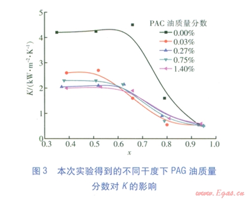 在設(shè)定實(shí)驗(yàn)條件下得到,小同工質(zhì)干度下PAG油質(zhì)量分?jǐn)?shù)對(duì)K的影響(見圖3)。由圖3可知,與無油工況相比,含油工況的K明顯下降。對(duì)于無油工況,在K急劇變化處干涸發(fā)生,并隨著工質(zhì)干度的增加,與含油工況的K差距縮小,最終趨于一致。