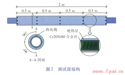 測試段為有效加熱長度為2m的半硬態(tài)水平光滑銅管(見圖2),內(nèi)直徑為4mm,外直徑為6mm,在測試段進(jìn)口、出口分別安裝壓力、溫度傳感器。在測試段每隔0.5m安裝熱電偶,以測量銅管外壁溫度,熱電偶用絕緣膠布固定在銅管外壁。電加熱絲采用直徑為045mmCr20Ni80合金絲,總電阻為82.5Ω,用于模擬蒸發(fā)器負(fù)荷。最外層設(shè)置絕熱層,起到固定和絕熱作用。電加熱絲與調(diào)壓器相連接,通過調(diào)節(jié)直流電壓來調(diào)節(jié)電加熱功率,改變測試段熱流密度。測試段熱流密度q的計(jì)算式為: