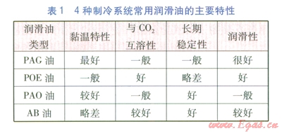 目前,制冷系統(tǒng)常用的潤滑油包括PAG(聚亞烴基乙二醇油)POE(脂類油)、PAO(α-聚烴油)AB(烷基苯類油)[11],主要特性見表1。
