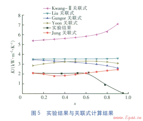 筆者選取5種經(jīng)典換熱關(guān)聯(lián)式,將本次設(shè)定實(shí)驗(yàn)條件(PAD油的質(zhì)量分?jǐn)?shù)固定為0.75)作為已知計(jì)算條件,比較實(shí)驗(yàn)結(jié)果與換熱關(guān)聯(lián)式計(jì)算結(jié)果,從中篩選出適于計(jì)算混合物水平光滑管內(nèi)流動(dòng)沸騰換熱系數(shù)的傳熱關(guān)聯(lián)式。