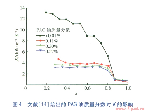 4與圖3類似,在低干度區(qū),C02主要以液態(tài)形式存在,對(duì)PAG油的溶解度較大,表現(xiàn)為PAG油質(zhì)量分?jǐn)?shù)對(duì)K的影響很大。隨著工質(zhì)干度的增大,尤其干涸發(fā)生以后,氣態(tài)C02的比例增大,氣態(tài)C02對(duì)PAG油的溶解性很差,大部分PAG油析出,PAG油質(zhì)量分?jǐn)?shù)不再是影響K的決定因素。最終,無油工況與含油工況的K趨于一致。