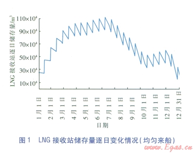 本方法綜合考慮目標(biāo)天然氣市場(chǎng)用氣需求情況、用氣特性、上游LNG來船情況,LNG接收站天然氣外輸量、LNG船卸載量、站內(nèi)LNG儲(chǔ)存量等指標(biāo)采用計(jì)算機(jī)編程進(jìn)行動(dòng)態(tài)分析,得出在均勻來船的情況下LNG接收站儲(chǔ)存規(guī)模、LNG接收站儲(chǔ)存量每日變化情況、LNG作為調(diào)峰的主力氣源時(shí)其所需要的儲(chǔ)罐數(shù)量及船期等情況。該動(dòng)態(tài)分析方法還可以通過調(diào)整上游LNG運(yùn)輸鏈中LNG船的船期用于“平谷抑峰”,既保障下游供氣和調(diào)峰的要求,又可以降低LNG接收站儲(chǔ)存規(guī)模,減少站內(nèi)LNG儲(chǔ)罐數(shù)量,減少LNG接收站投資。