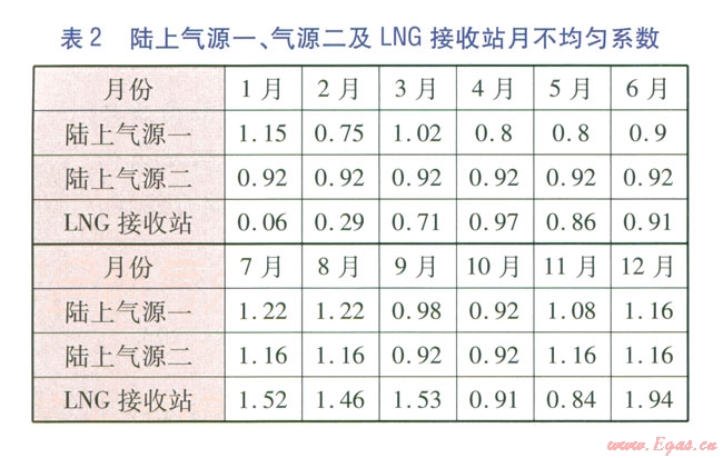 該地區(qū)共存在4種氣源供氣,其中陸上氣源一供氣量為30×108m3/a,陸上氣源二供氣量為18×108m3/a,陸上氣源三供氣量為36×108m3/a,LNG氣源供氣量為30×108m3/a。陸上氣源一和氣源二月供氣特性見表2;陸上氣源三為均勻供氣。LNG接收站用于承擔(dān)該地區(qū)除陸上氣源調(diào)峰外的所有季節(jié)調(diào)峰,可通過供需平衡和各氣源供氣特性計(jì)算出每月LNG接收站外輸量,得出LNG接收站供氣的月不均勻系數(shù)(見表2)。