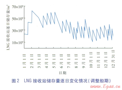假設(shè)該LNG接收站LNG設(shè)計(jì)儲(chǔ)存規(guī)模為64×104m3 (4座16×104m3LNG儲(chǔ)罐),通過動(dòng)態(tài)分析方法計(jì)算結(jié)果可知,每年需調(diào)整LNG船的船期,其中:2、3、5月份需各減少接收l船LNG;8、9、12月份需各增加接收l船LNG;其余月份仍保持每月接收2船LNG不變。通過調(diào)整船期方法得到的LNG接收站儲(chǔ)存量逐日變化情況見圖2.