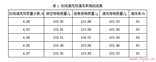 我們進行了在線清洗劑清洗率測試,測試結(jié)果見表1。由表1可知,在線清洗劑的清洗率可達93%以上,說明清洗效果理想。