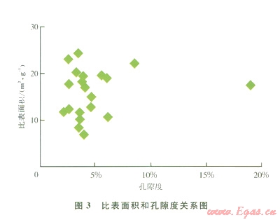 頁巖儲層為裂縫-孔隙結(jié)構,成巖作用過程中形成的裂縫和微孔是頁巖氣儲集空間和滲流通道。微孔對頁巖氣的儲存具有重要意義,一般而言,微孔體積越大,比表面積越大,對氣體吸附能力也就越強。國外測定的含氣頁巖巖心數(shù)據(jù)㈠表明,孔隙度與總氣體含量正相關,受孔徑分布影響。圖2為國外實驗室測定的頁巖孔隙度與含氣量關系。